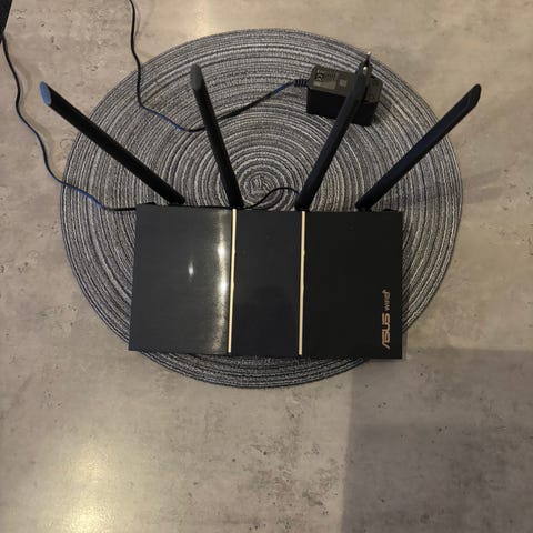 ASUS RT-AX1800U Router med Dual Band WiFi 6 (802.11ax) teknologi. Støtter trådløs hastighet opptil 1800 Mbps, har flere LAN-porter og USB-tilkobling. Designet for å gi stabil og rask nettverkstilkobling i hjemmet eller små kontormiljøer.