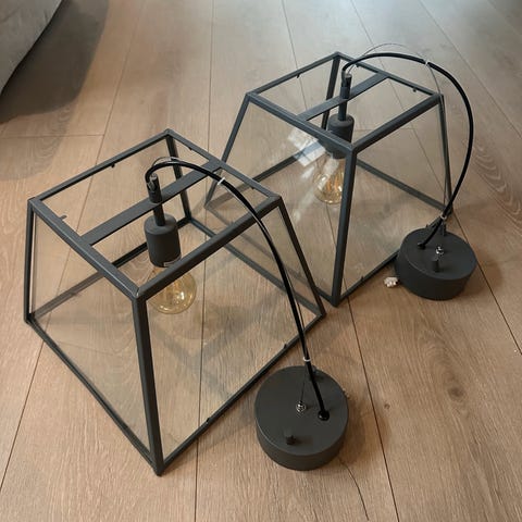 Lystett gardin str 140x160 farge grå, ubrukt. To lamper, en kjøkkenlampe hvit brukt i to mnd, og en sort lampe fra lampegiganten ikke brukt selges billig.