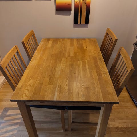 Selger et fint bord med kryssbein med eikefiner. Noen bruksmerker, se bilder. Kan være behjelpelig med levering i Ålesund.