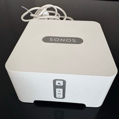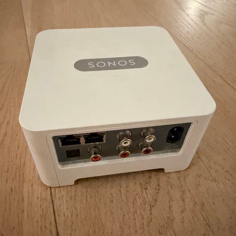 Sonos lydbro i hvit farge. Enheten har tilkoblingsporter for nettverk og strømadapter. Designet for å forbedre trådløs lydforbindelse i hjemmenettverk.