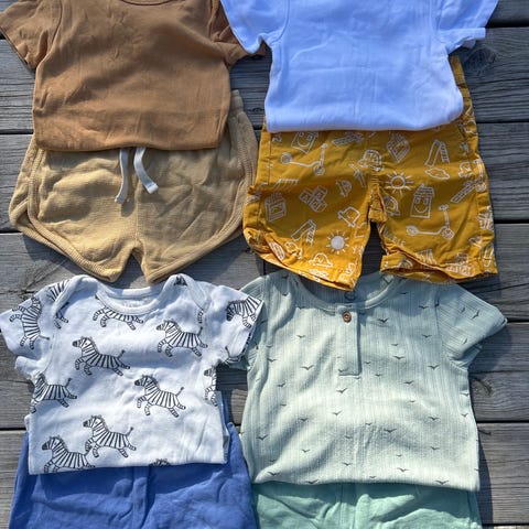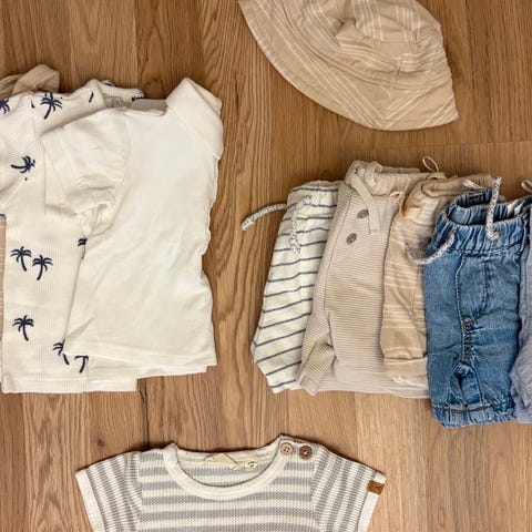 Pakken inkluderer solhatt, caps, t-skjorter og shorts med maritimt motiv.