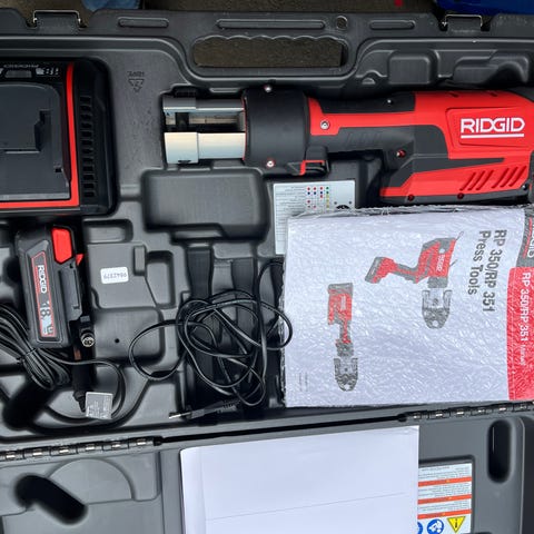Helt ny og ubrukt Ridgid RP219 pressmaskin med batteri og lader. Verktøyet leveres i koffert med tilbehør og brukerveiledning.