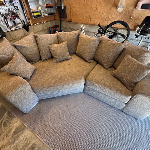 Grå hjørnesofa med flere ryggputer. Sofaen har en L-form som gir god sitteplass og komfort. Stoffmateriale i grå farge. Passer for stue eller oppholdsrom. Kom med bud. Kjøpt ny for 3 år siden på A-møbler.