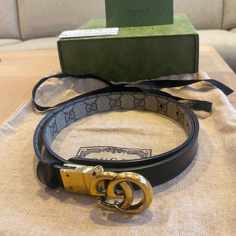 Gucci belte for unisex, laget av brunt lær med GG-mønster på innsiden. Beltet har en gullfarget spenne med dekorative detaljer.