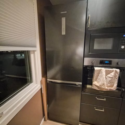 Med vanndispenser, isbiter, crushed is og kaldtvann. Ikke tilkopling til vann. 111kg. Stål, ripe i kjøleskapsdør på høyre side..( i høyde med håndtak på stekeovn)