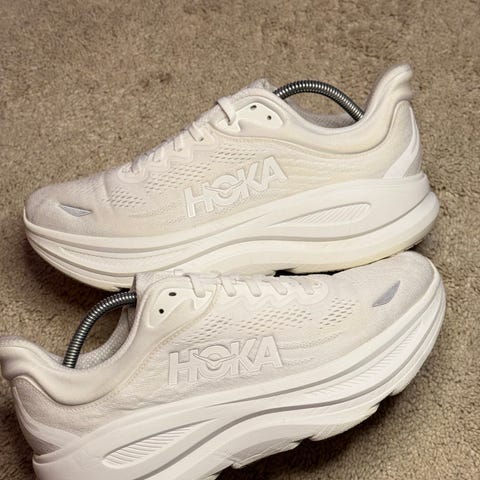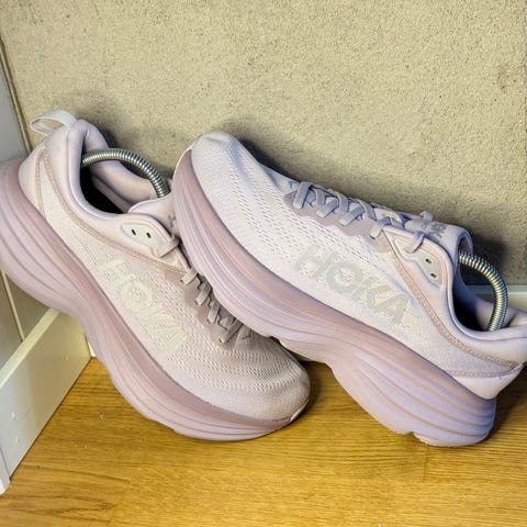 Hoka Bondi 8 løpesko i størrelse 45 med grå farge. Skoene har en dempet såle designet for løping og gir støtte og komfort ved bruk. Ikke brukt. Helt nye. Strørrelse passer ikke