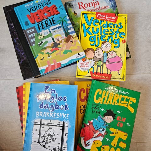 Diverse barnebøker ulike titler og størrelser