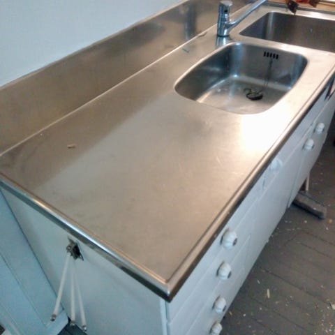 Stål oppvaskkum, rund. Med avløp og laminat benkeplate. Gis bort.