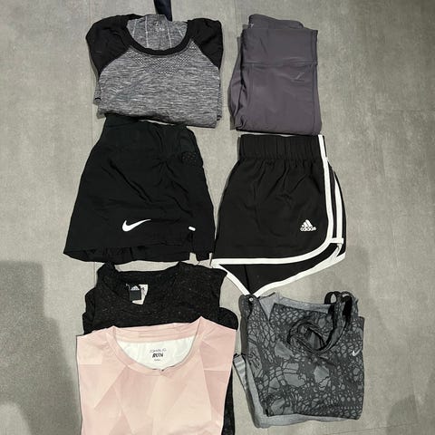 Klespakke, selges samlet: treningsklær/fitnessklær for kvinner i størrelse S. Inkluderer ulike typer plagg som t-skjorter, hettegensere og shorts i forskjellige farger og materialer.