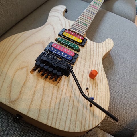 Håndlaget 80's style super strat fra engelske Kemp Guitars.