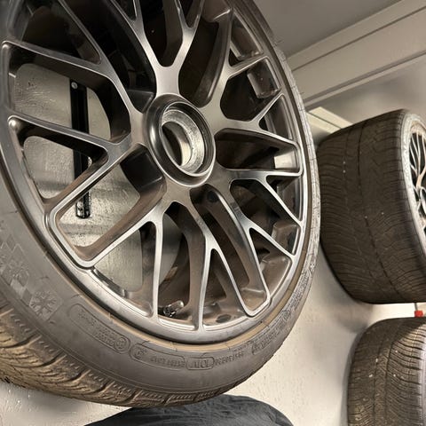 Felger til Porsche selges. Felgene er i god stand og ble vasket da de ble demontert bilen. Felgene står på slitte sommerdekk og er ikke særlig å spare på. Men de tåler nok noen måneder til om de skal tynes.