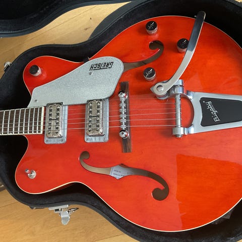 Selger min Epiphone Sheraton II 2003-modell da jeg ikke bruker den og den bare står og tar opp plass. Kjøpt brukt i 2017. Så vidt blitt spilt på de siste årene. Gitaren er i god stand, men har noen problemer med fret buzz på de høyere båndene. Har dessverre ikke det opprinnelige plekterbrettet.