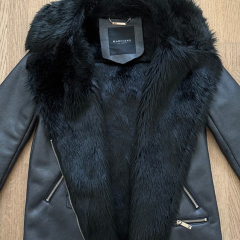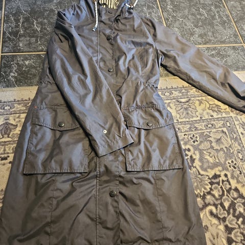 Strechy, kroppsformede, Bandageaktig - nydelig svart kåpe. Strl L men mindre i strl. Vil si S-M / jeg er S og den passer meg perfekt.