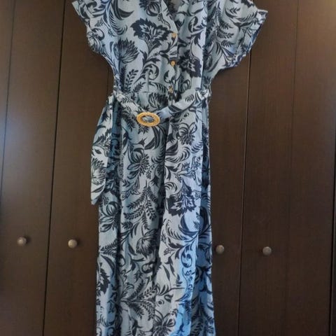 Nydelig sommerkjole i størrelse S (stor S) flerfarget mønster, laget av polyester. Kjolen har lange ermer og en lang lengde, egnet for kvinner.