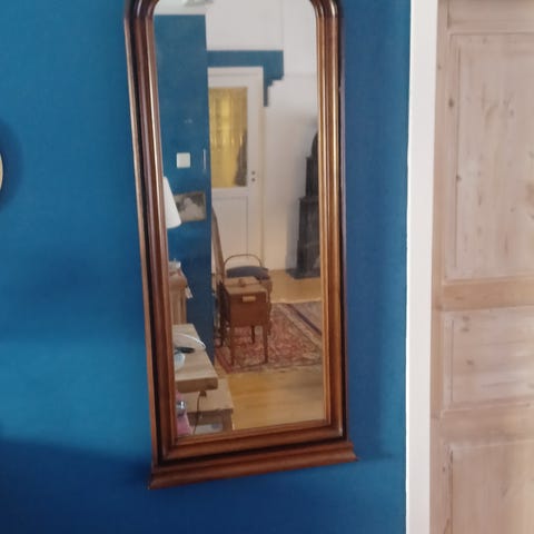 Lang speil. En liten skade på venstre side helt nederst. Den kan finne dekkes med en vase foran. Slik at den ikke er synlig.