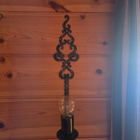 Taklampe, vegglampe og bordlampe i samme serie. Lampene er laget av smijern og glass. Brukt på hytte.
