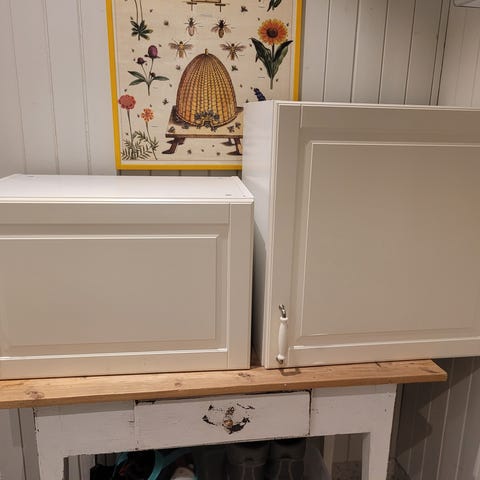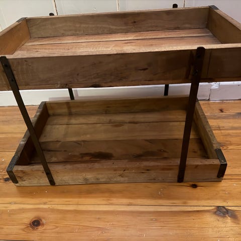 Selger to svært praktiske og stødige kjøkkenøyer i massivt tre. Disse er perfekt som ekstre arbeidsflate, avlastningsbord eller som èin stilig kaffestasjon på kjøkkenet.