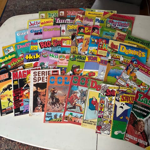 Diverse blader fra 70 og 80 tallet, mest åtti åra. Samling bl.a med Agent X9, Dennis, Binky, Colt, Asterix, Donald og Disney Godbiter. Alle er godt lest, noen litt bedre men flest i Good - Very Good. Sendes ikke, må hentes, bor sentralt i Kristiansand (D)