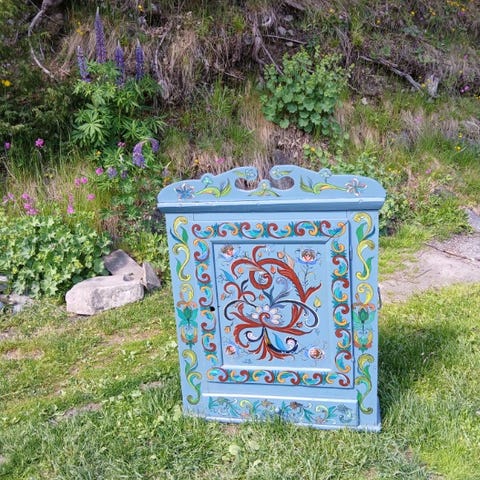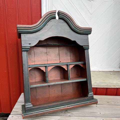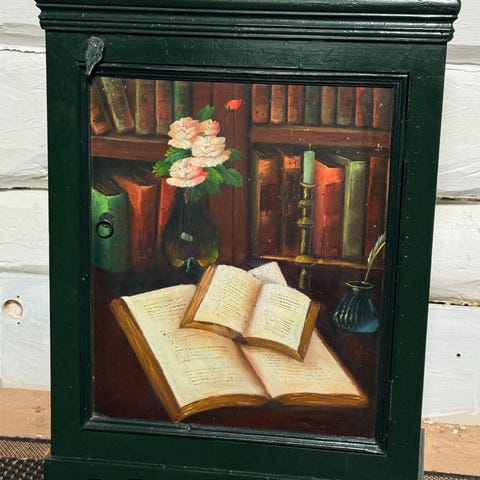 Veggskap i tre med buet topp og to dører. Størrelse; Bredde;70 cm, Høyd;77cm og dybde;20 cm Skapet er malt mørkegrønt med brune fyllinger og listverk. Innvendig har skapet flere hyller med inndelte rom. Passer til veggmontering i hytta ; i stue, kjøkken eller gang . (Bør helst hentes i Larvik)