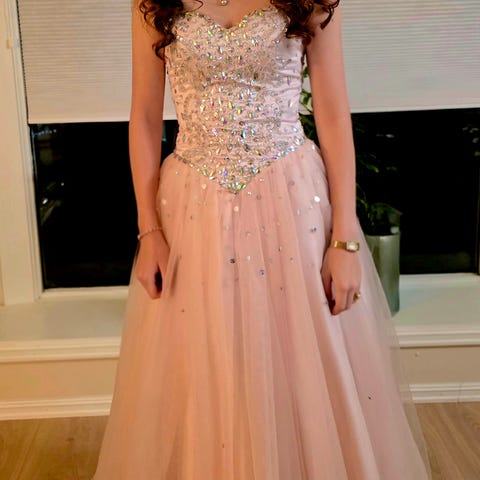 Kjolen er ikke mye brukt, og er i god stand. Den er i en fin champagne farge, som du ser på bildet. Overdelen av kjolen består av diamanter og paljetter, som plassert i mønster og går gradvis over til skjørt-delen, som er glitrende tyll. 🎀 Kjolen er sydd inn til størrelse xs, men dette kan enkelt fjernes så den blir s. Spesifikke mål for kjolen er:
