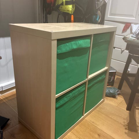 Dette er 2 stk Kallax hyller som står oppå hverandre. De er godt brukt av barn, sikkert litt riper her og der, derfor jeg selger de så billig. Det er også et hull som du ser på bilde etter at vi skrudde de fast i veggen. 100kr stk. kom å hent selv.