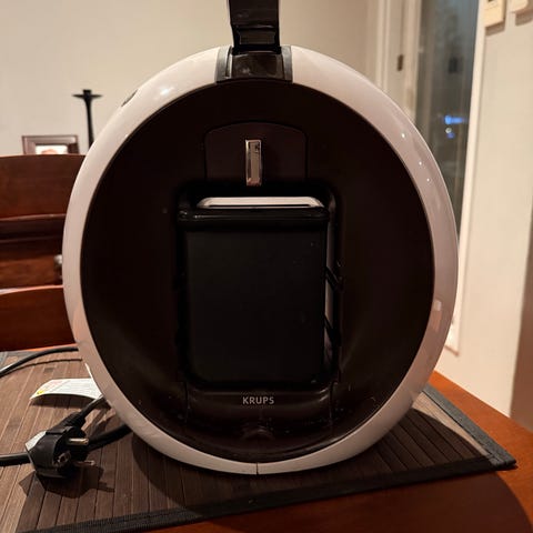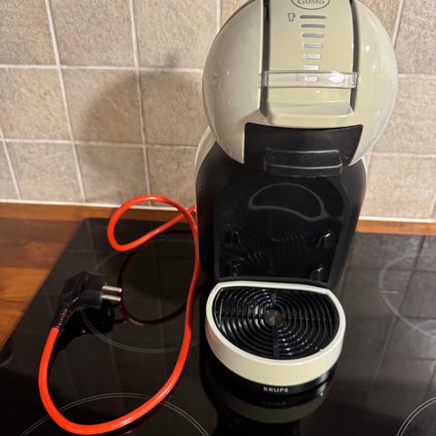 Krups kapselkaffemaskin i svart farge. Designet for bruk med kaffekapsler. Kompakt størrelse egnet for hjemmebruk.