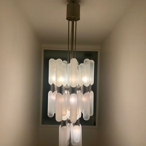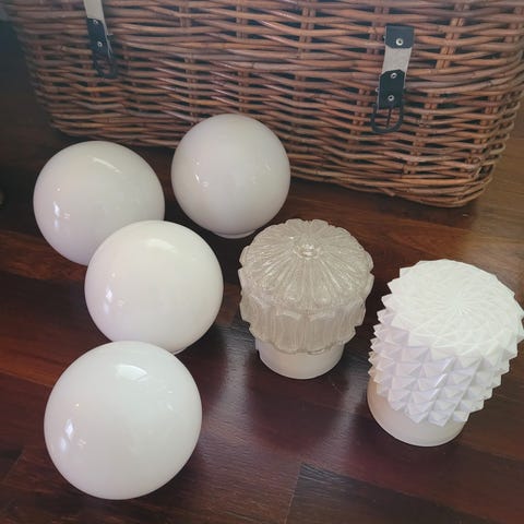 Kul, retro lampekuppel i opalinglass med keramisk sokkel. Kan brukes både som taklampe eller bordlampe. Pakker svært godt ved sending.