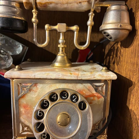 Vintage telefon med dreieskive i metall og håndsett med detaljer i tre. Telefonen har en rund base og klassisk design, egnet for samling eller dekorasjon.