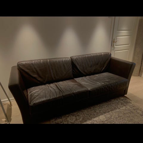 Sofa i skinn fra Home & Cottage mål:1,80 cm lengde,72 cm høyde fra gulv til topp på rygg,97 cm dybde