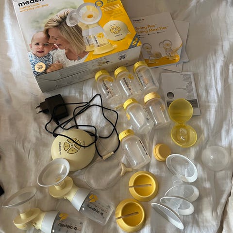 Medela Swing elektrisk brystpumpe med tilbehør for pumping og oppbevaring av morsmelk. Inkluderer pumpeenhet, flasker, slanger og diverse deler. Inneholder det som er vist på bildet.