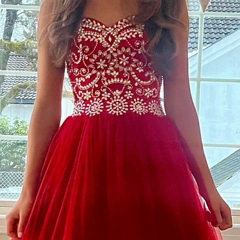 Nydelig og eksklusiv ballkjole i dyp bordeauxfarge. Kjolen har et elegant, skulderfritt snitt og et figurnært liv med vakre, detaljerte broderier. Det vide skjørtet gir en flott og feminin silhuett og et virkelig glamorøst uttrykk.