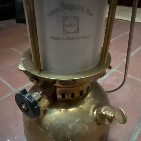 Ukjent merke kobberlampe med perforert mønster. Lampen har en sylinderformet konstruksjon og inkluderer en lyspæreholder. Materialet er kobber, og designet har hull som gir et dekorativt lysmønster.