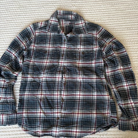 Carhartt rutete skjorte i svart og hvitt fra Carhartt Kids. Skjorten er merket størrelse L (12–14 år) og har Loose Fit-passform. Den har knappelukking og brystlomme med Carhartt-logo. Skjorten er brukt og har normale bruksmerker, men fremstår hel og fullt brukbar. Et solid plagg som passer godt til barn eller ungdom og gir et klassisk workwear-uttrykk.