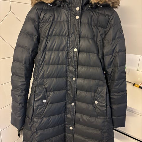 Jean Paul boblekåpe for kvinner i størrelse S. Jakken er grå og har en polstret design med hette. Den er laget for utendørs bruk og har lukkemekanismer foran med både glidelås og knapper.