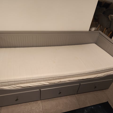 Hvit enkeltseng med madrass og overmadrass med trekk som kan vaskes.