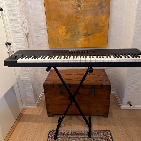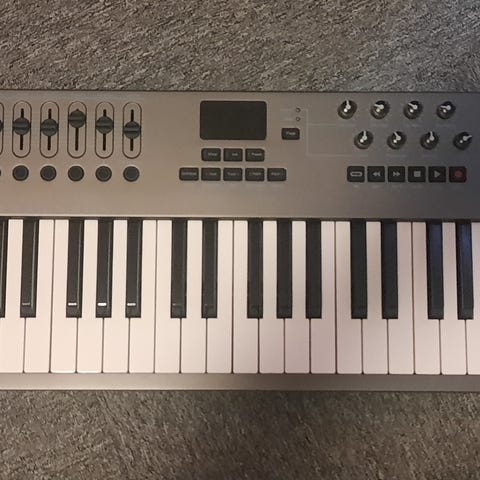 Native Instruments Komplete Kontrol S49 Mk2. MIDI Keyboard Controller med 49 semivektet Fatar tangenter og aftertouch. Utstyrt med to fargedisplayer, flere kontrollhjul, knapper for navigasjon og funksjonsinnstillinger som octave justering, tempo, metronom og loop kontroll. Designet for musikkproduksjon og live bruk, kompatibel med Komplete programvare. Mye omtaler på Youtube. Må hentes da original embalasje ikke eksiterer lenger