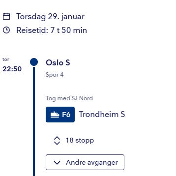 Fra Voss 1/2 kl. 18:06, fremme i Sandvika kl. 23:49.