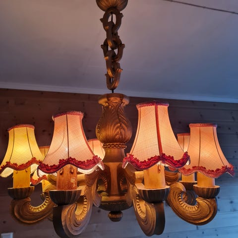 Lysekrone med 5 kupler i matt glass. Gir godt lys