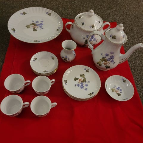 Firkløveren servise som inkluderer kaffekanne, kopper med skåler, tallerkener, sukkerskål, fløtemugge, lysestaker og salt- og pepperbøsser. Serviset har et blomstermotiv med gule og lilla tulipaner, og er laget i porselen. Serviset er til 12 personer, men har vært uheldig og knuse en kopp.
