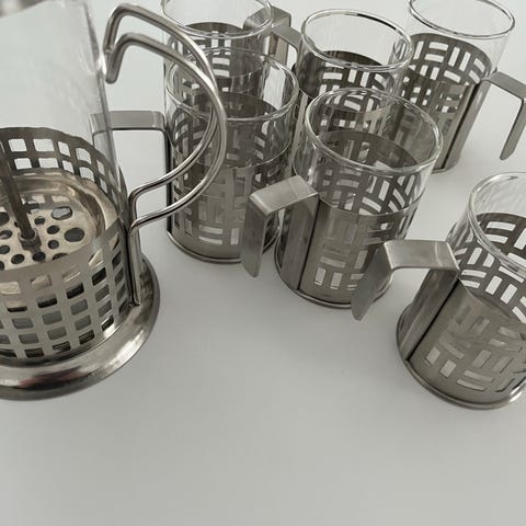 Selger to pene glasskrus med avtagbar metallholder. Perfekt for varme drikker som te, kaffe, gløgg eller Irish Coffee. Metallholderen fungerer som både et stilig håndtak og beskytter hendene mot varmen fra glasset.