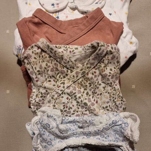 Helt ny med lapp - lys rosa Polarn O. Pyret babybody str. 56 jente med blomstermønster. Bodyen er lyserosa med et mønster av små hvite og rosa blomster og er laget av bomull og elastan. Den har lange ermer og søte detaljer med volanger på skuldrene 🌸 Søtt blomstermønster i duse rosa farger. Knappelukking på begge sider av halsen ☺️