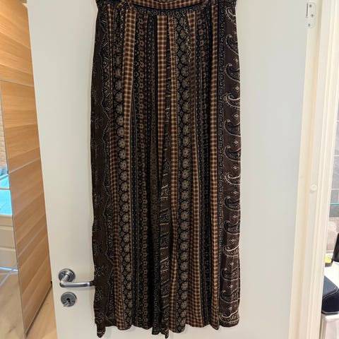 Nydelig skjørt fra 90 tallet selges. Er i flotte brun nyanser. Strikket i livet har mistet en del av elastisiteten, så selges derfor rimelig. Mål: Lengde: 105 cm. Livvidde: 92 cm. Sender gjerne.