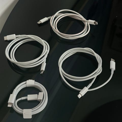 Apple ladekabler i hvit, alle er USB C til Lightning.