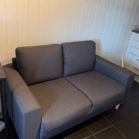 Sofaen må hentes, men hjelper deg gjerne med å bære.