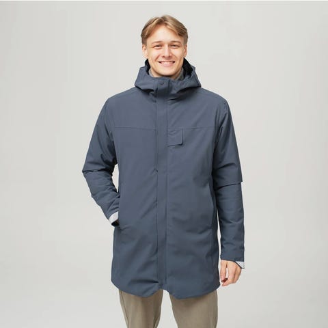 Jakken har innebygde varmeelementer og justerbar varme via knapp på brystet. Powerbank følger med (se bilde). Gir behagelig varme uten å være tung eller klumpete.