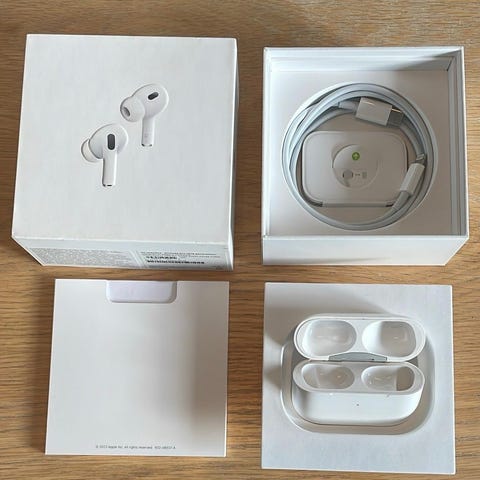 Apple AirPods Pro2 (2023) trådløse hodetelefoner i hvit farge. Inkluderer ladeetui, øreknotter og ladekabel. Designet for trådløs tilkobling og aktiv støydemping.