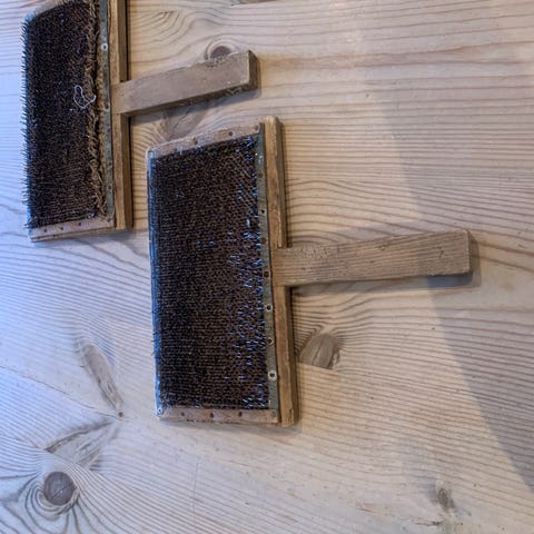 En "tull" med ull fra Sjølingstad Uldvarefabrik vasket/renset og klar til karding. Størrelsen på "tullen" er som en stor badeball, omkrets 120 cm. Vekt ca. 1, 2 kg.