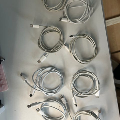 Apple ladere med tilhørende ladekabler. Produktet inkluderer flere ladere og kabler, egnet for lading av kompatible Apple-enheter.