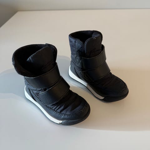 Sorel barne vintersko i størrelse 27, designet for unisex bruk. Skoene har en slitesterk yttersåle med godt grep, isolert og vannavstøtende materiale for å holde føttene varme og tørre under kalde værforhold. Innersålen i ull kan taes ut og tørkes enkelt.