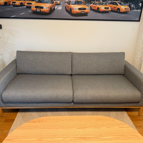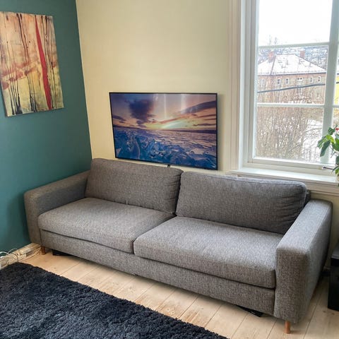 Brukt Bolia North. Hel i stoffet, en liten løs tråd i en av putene (se bilde). Puffen er i et tilsvarende stoff, omtrukket i litt annen fargetone for et par år siden (se bilde).